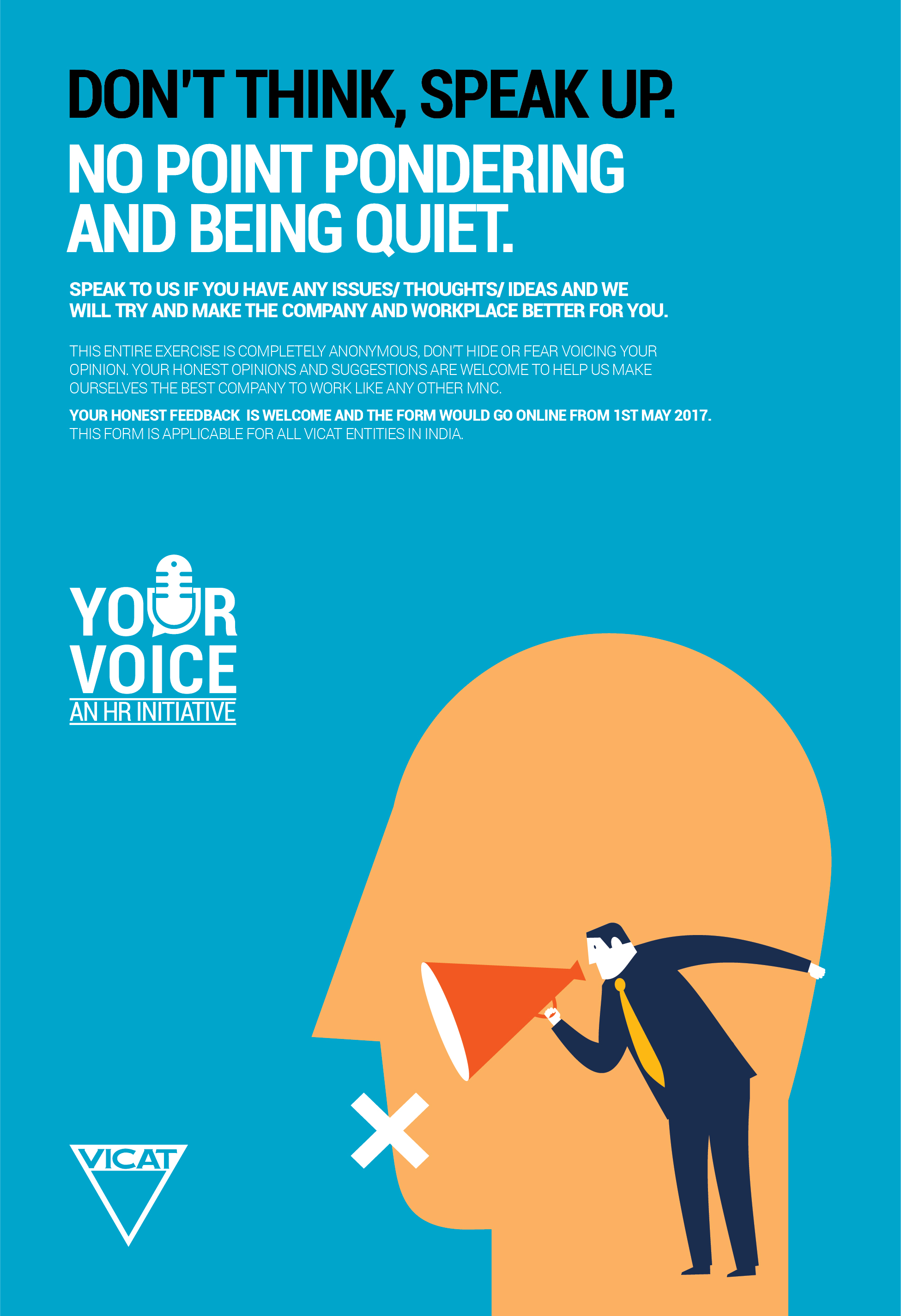 If you feel that an opinion could sound otherwise, the try not to share it in public forums and keep it a more private affair. So here's a platform that lets you speak to us if you have any issues/ thoughts/ ideas and we will try and make the company and workplace better for you.